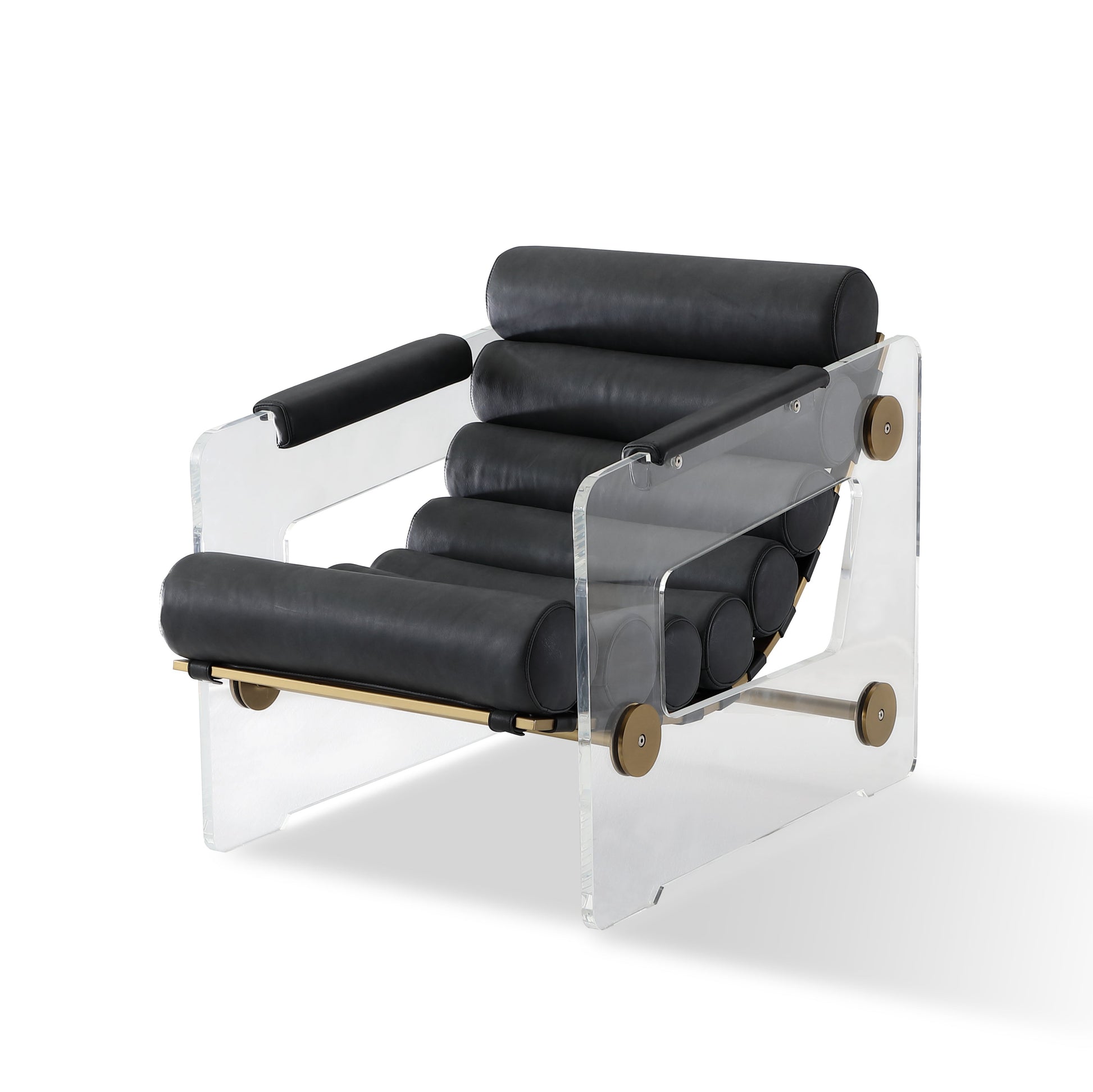 The Lumiere occasional chair is a show-stopping fusion of retro flair and modern luxury. Crafted with a striking acrylic frame, this piece features plush rolled cushions upholstered in soft leather for bold visual impact and supreme comfort. Brass support detailing adds a touch of vintage glam, making it a standout piece in any curated interior. Perfect for design-forward living rooms, lounges, or statement seating areas.