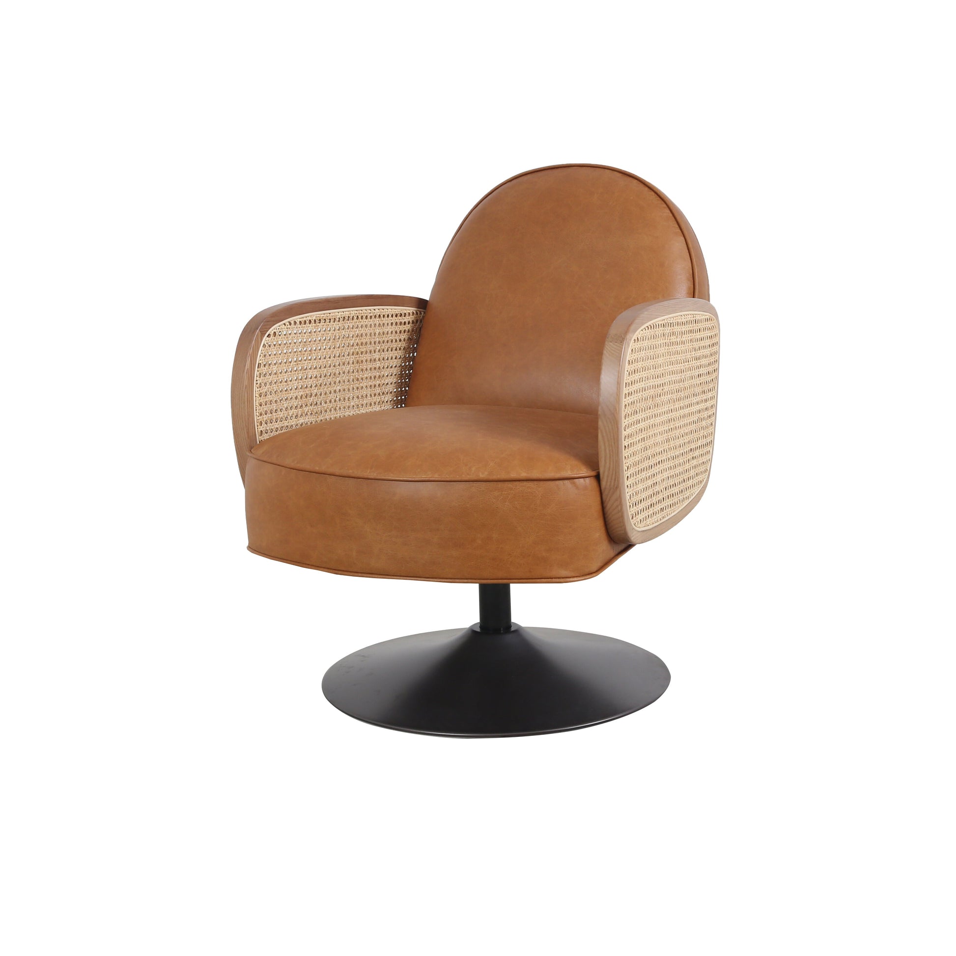 This Abaco swivel chair blends island-inspired charm with sleek modern design. Featuring smooth leather upholstery and distinctive rattan-wrapped arms, it evokes a relaxed Bahamas aesthetic with a refined twist. The rounded silhouette and swivel base offer comfort and versatility, making it ideal as an occasional chair or a stylish alternative for the home office. A perfect fusion of natural texture and contemporary elegance.