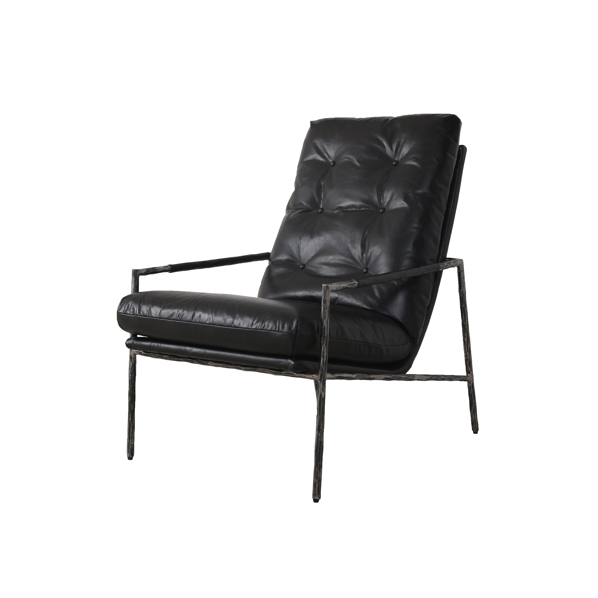 The Miro occasional chair offers a striking balance of rugged elegance and luxurious comfort. Upholstered in soft, premium leather with classic button tufting, it rests on a distinctive hammered metal frame that adds artisanal texture and industrial appeal. A sleek, sculptural silhouette makes it a refined addition to any modern living space, study, or lounge.