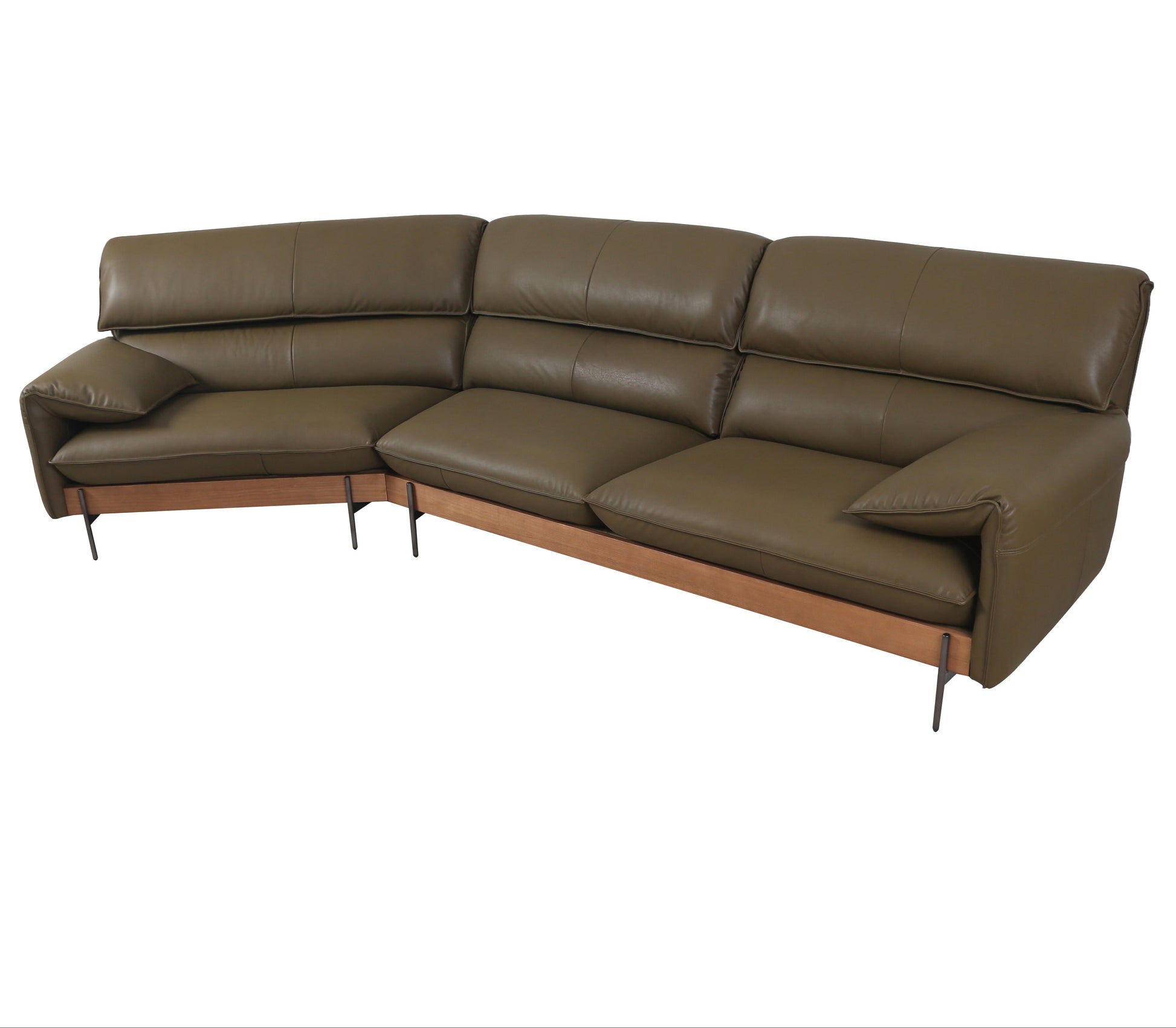 The Fjord curved leather sectional offers a striking blend of modern elegance and inviting comfort. Wrapped in incredibly soft, premium leather, its sculptural form features a stylish curved profile that enhances flow and conversation in any room. Distinctive folded envelope arms add a tailored, architectural touch, while the sleek wooden base and slim legs complete the look with refined sophistication. A bold statement piece designed for luxurious, contemporary living.